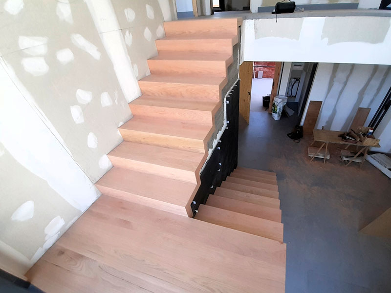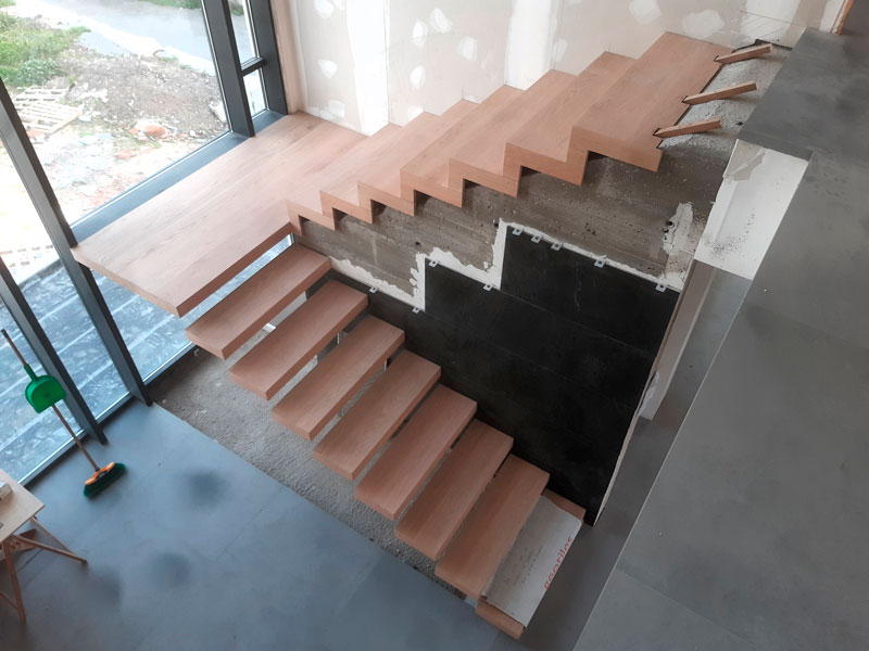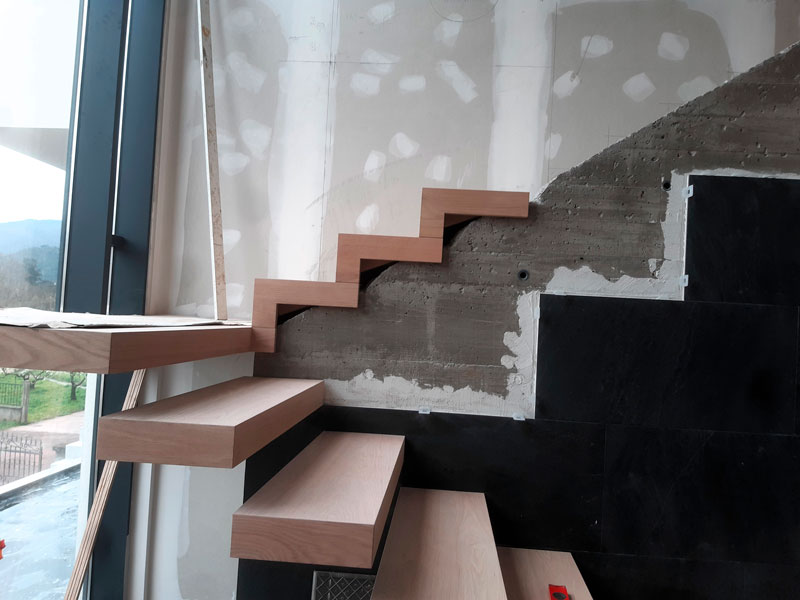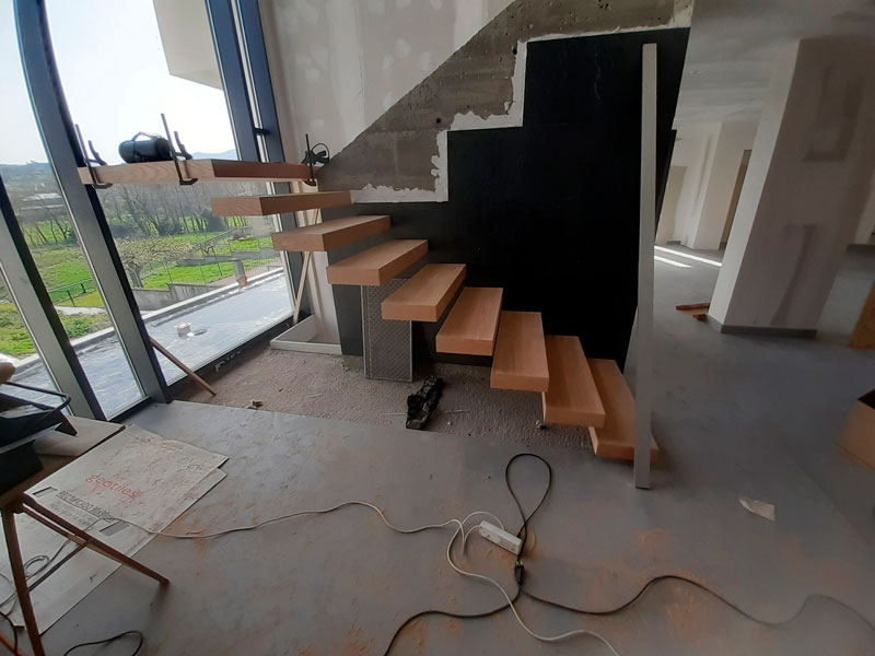Este tipo de escaleiras e un concepto de tendencia actual e esta fabricada en madeira maciza de Roble branco americano. Na parte bolada que se sustenta sobre a estrutura metálica os pasos están fabricados como una funda para acoplarse de cabeza deixando a estrutura metálica totalmente oculta. Os pasos están armados e encolados mediante xunta macho – femia a inglete.