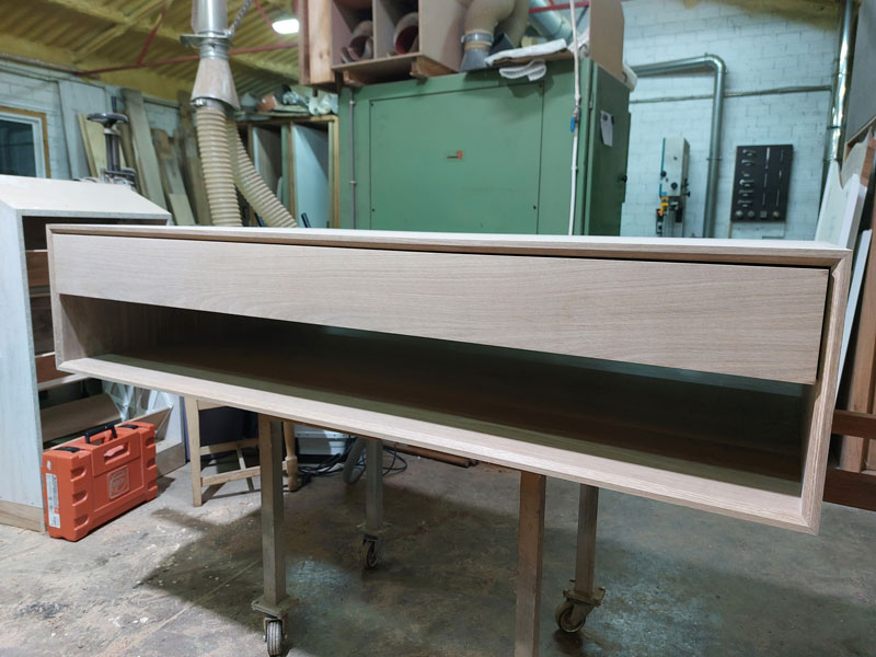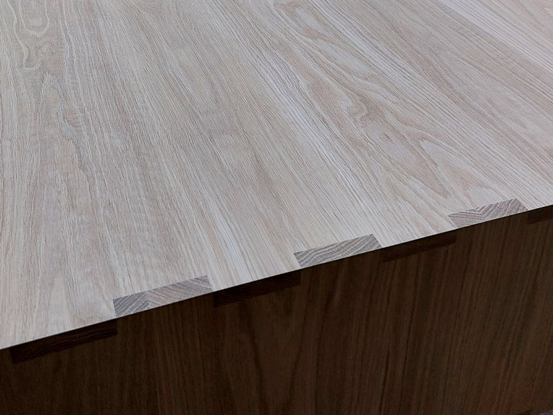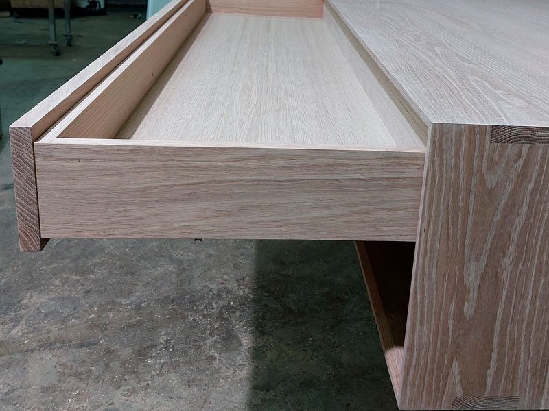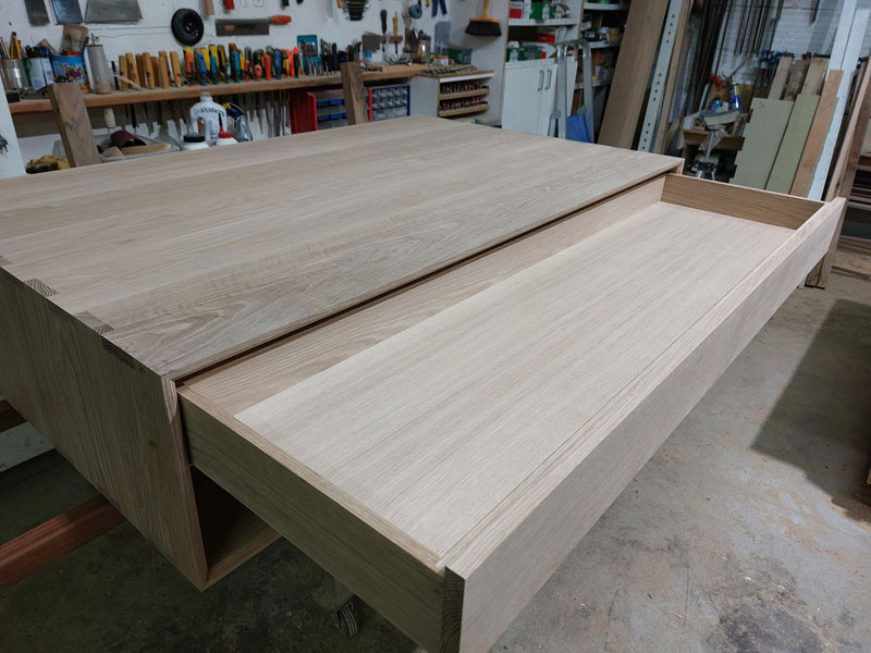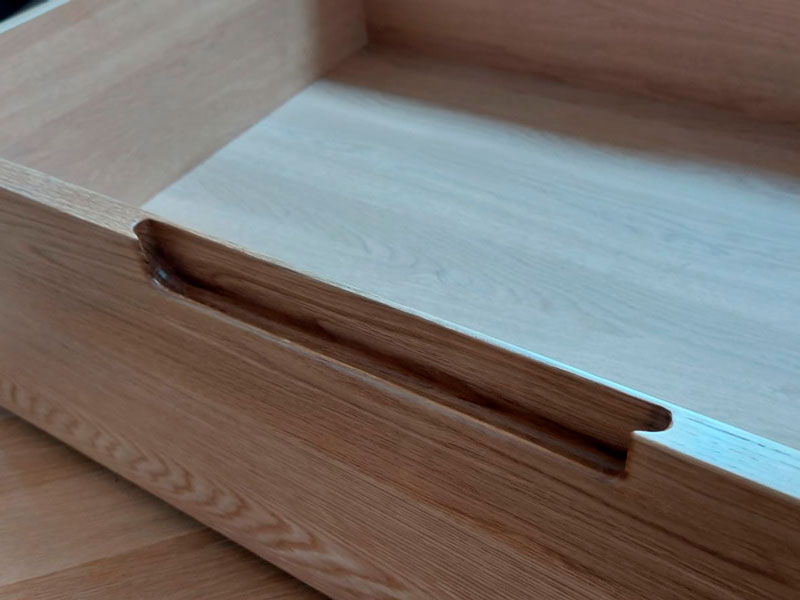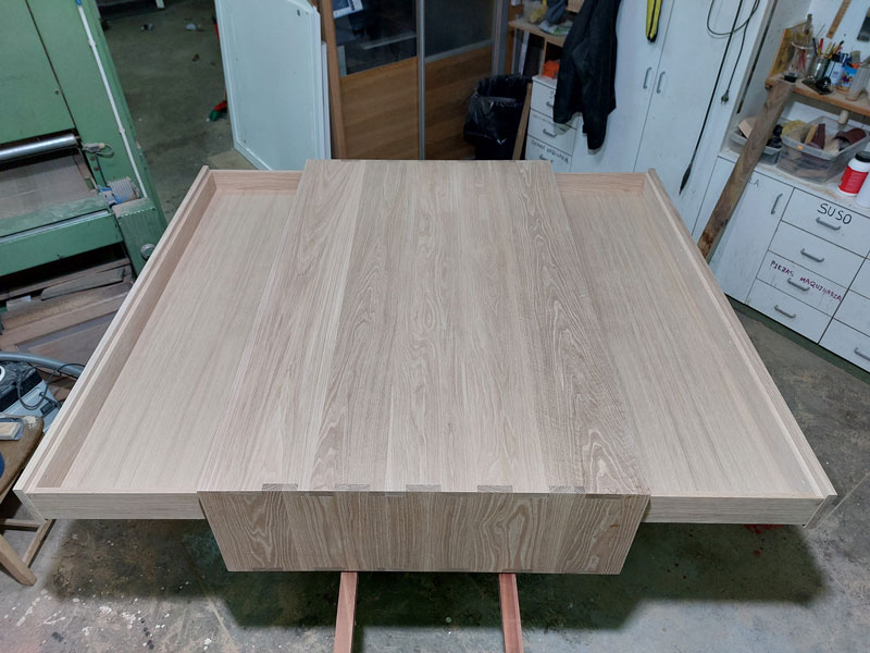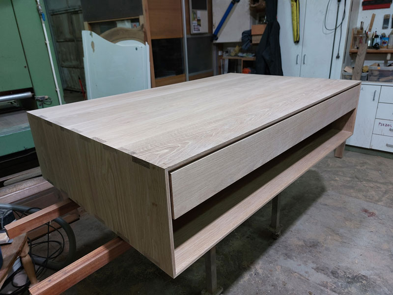 Mesa de centro baixa fabricada en madeira maciza de Roble branco americano, como detalle peculiar temos as unións do conxunto mediante ensamblado de unión recta, perfilado de liñas rectas no exterior e biselado a 45 grados nas partes interiores para facilitar a apertura dos caixóns que en este caso non levan tirador.