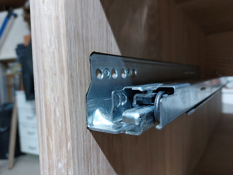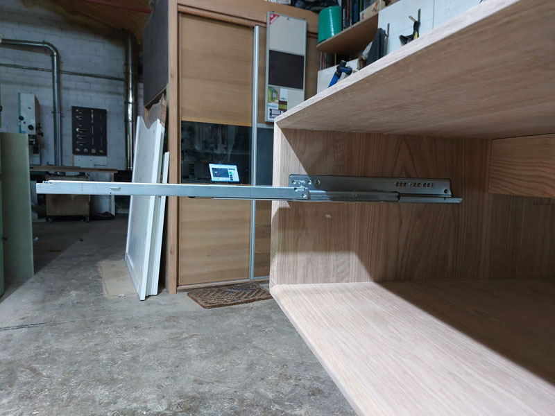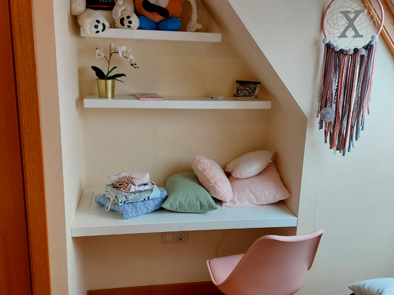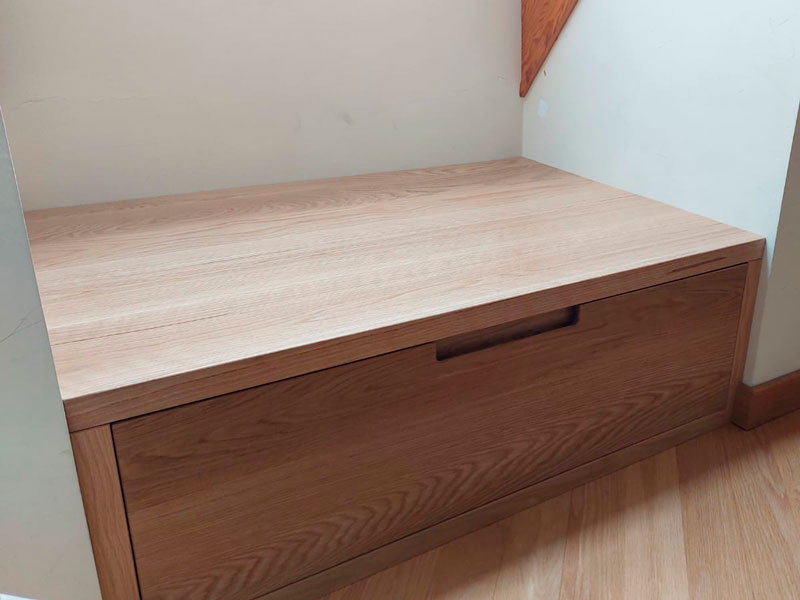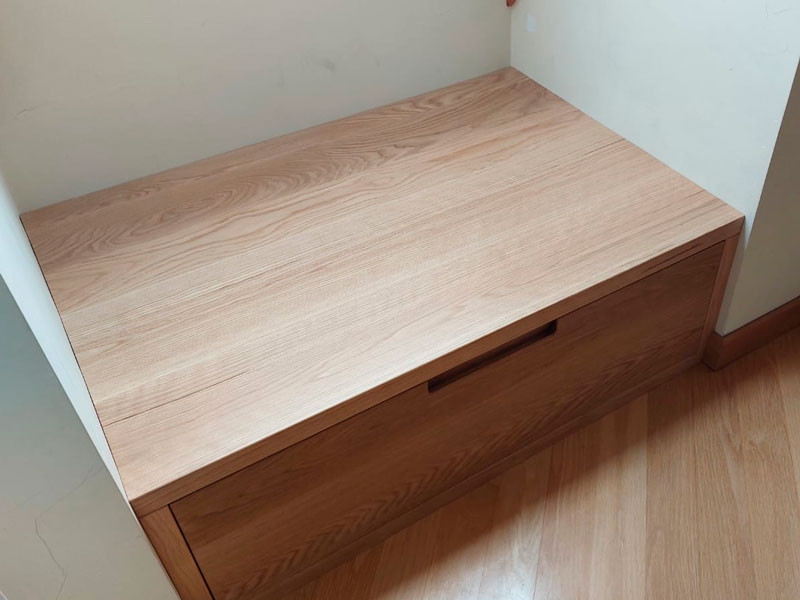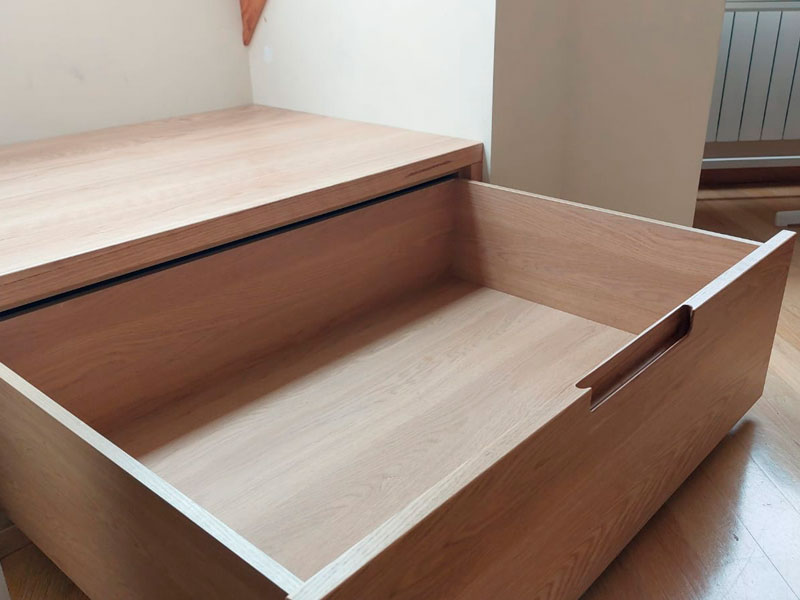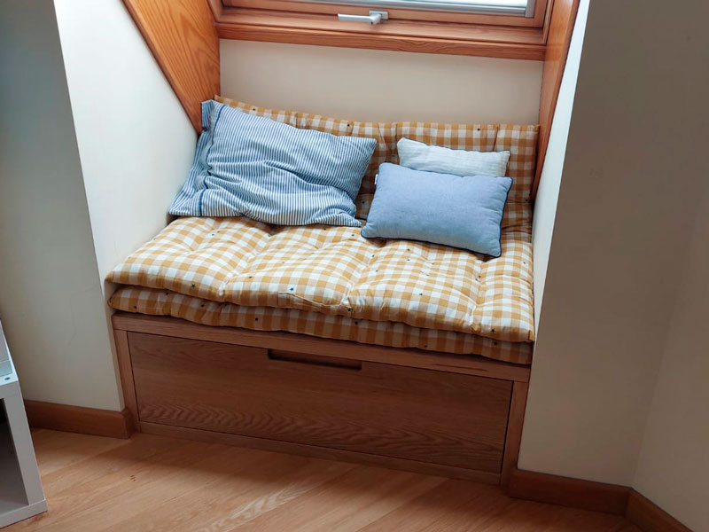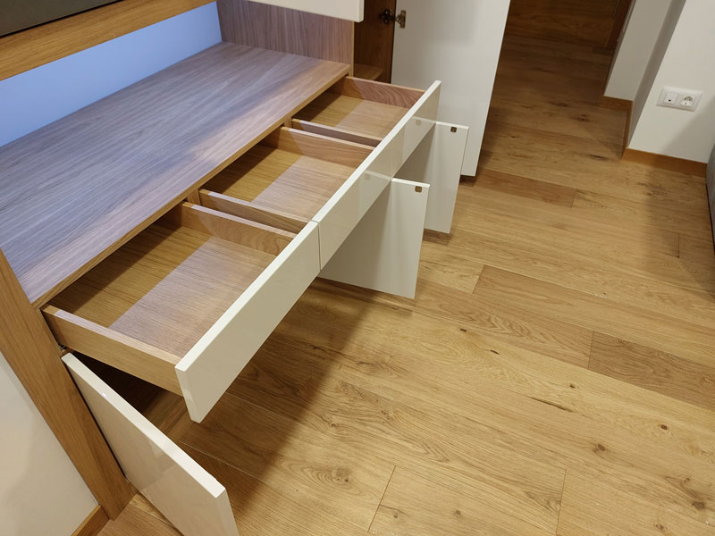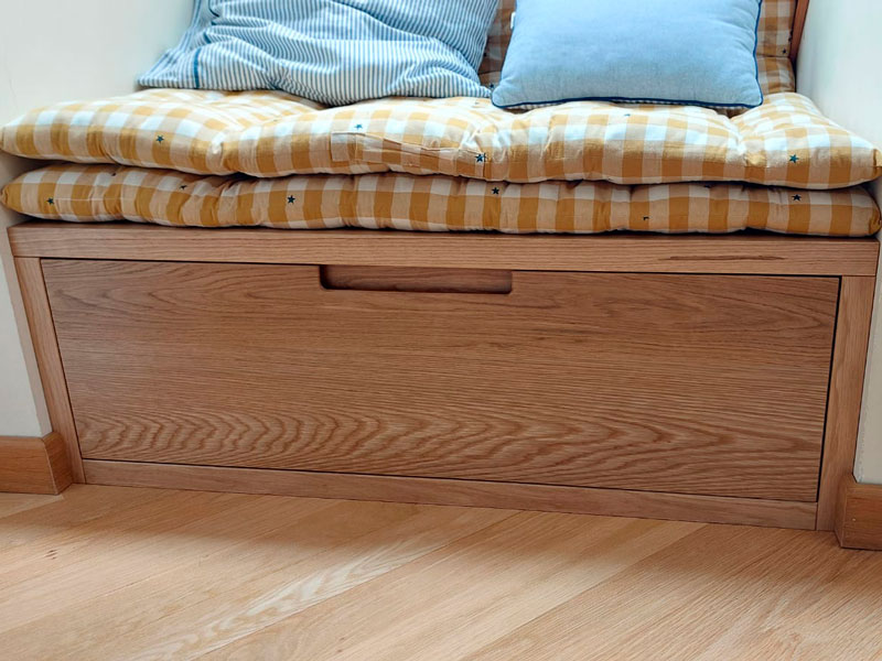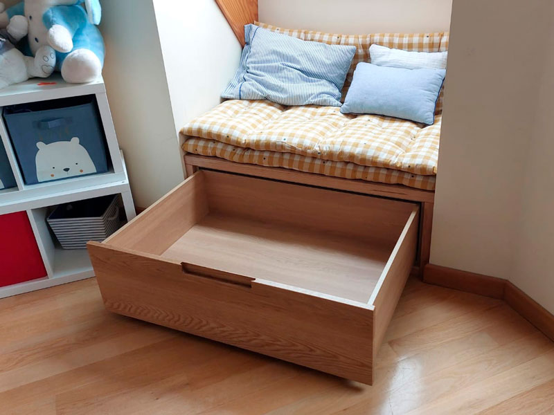 Estes conxunto de habitación infantil esta composto por armario, escritorio e caixón con tapa de asento. Este ultimo esta fabricado en madeira de Roble branco americano e esta equipado con guías SALICE con carga de ata 70 kg. Para a apertura de caixón fixen un uñeiro fresado no propio fronte do caixón.
