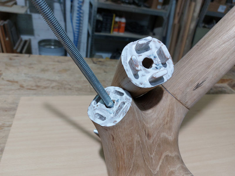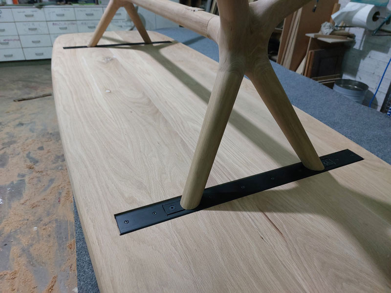 Mesa de deseño especial fabricada integramente en madeira maciza de Roble americano branco, as unións están reforzadas con placas metálicas unidas a vara roscada de 14 mm.