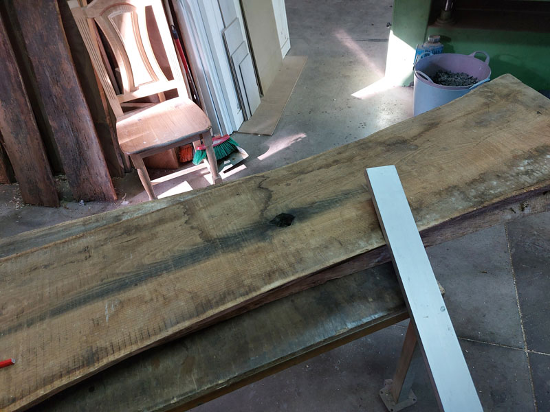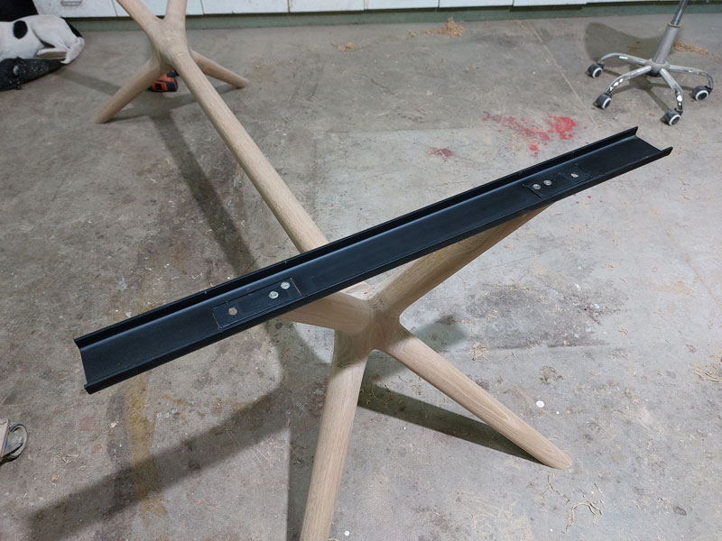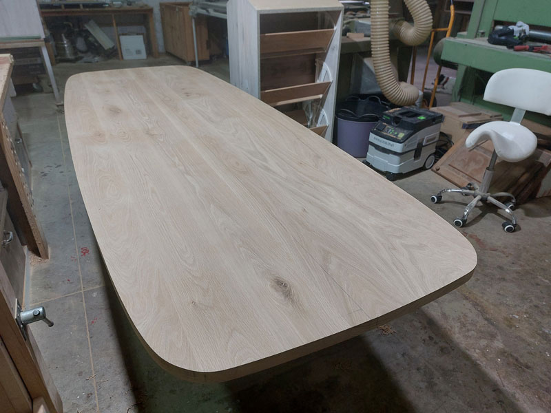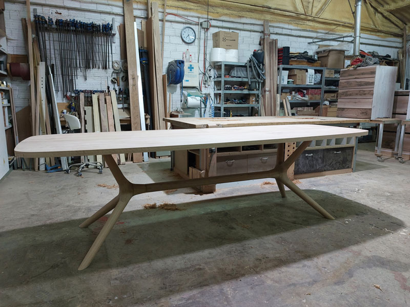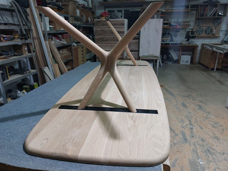 A peculiar forma da estrutura inferior requiriu moito traballo con ferramentas manuais ata lograr a forma e medida desexada. A tapa da mesa ten una lonxitude de 280 cm lixeiramente ovalada aínda que nos extremos sexa recta.