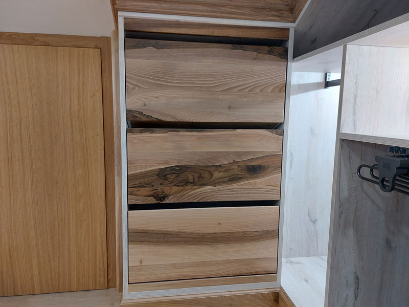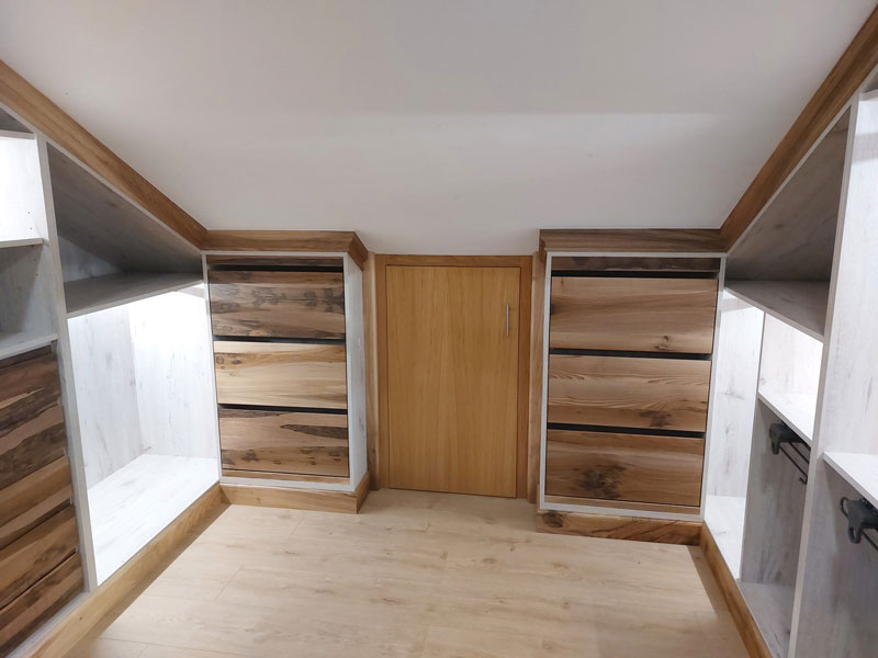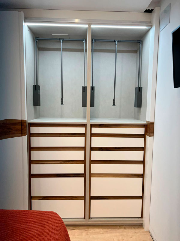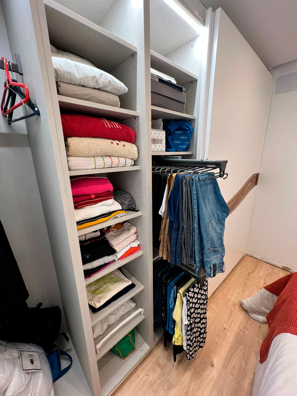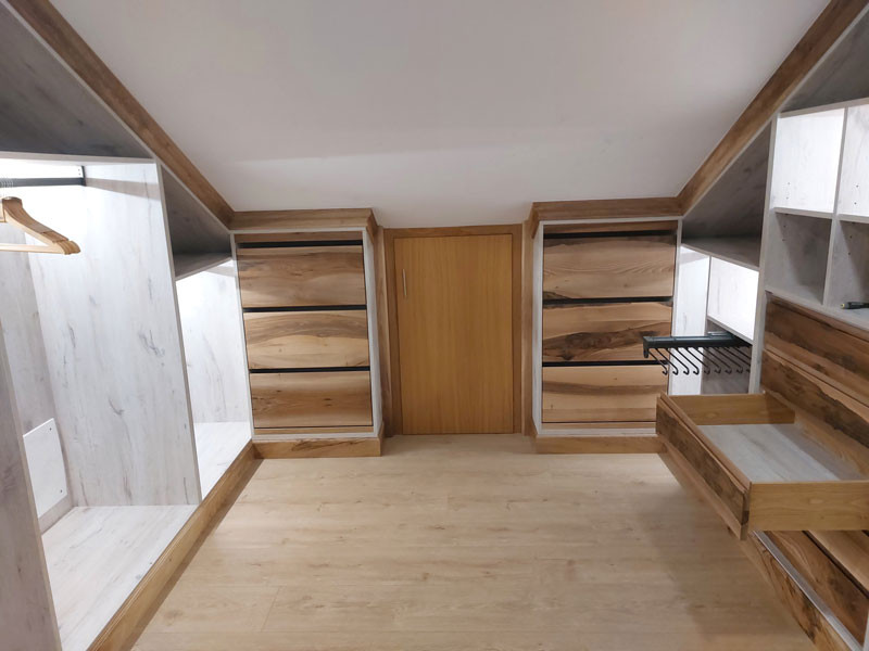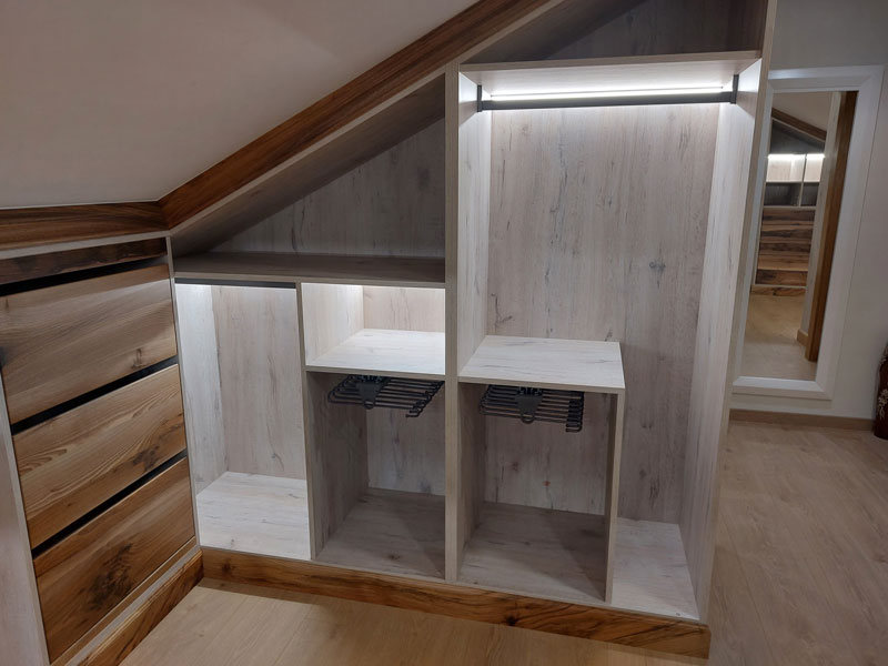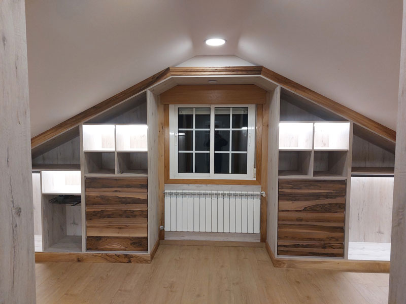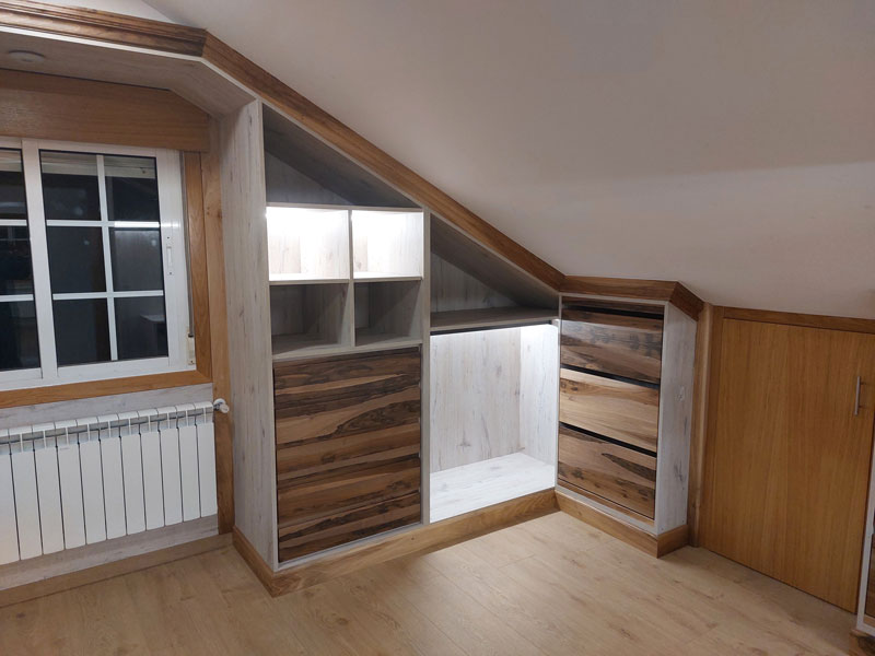 Vestidor adaptado a teitos inclinados baixo cuberta. Fabricado en taboleiro de melamina hidrófuga de deseño nórdico, con frontes de caixón, frontes de zapateiros, zócalos e cornixas en madeira maciza de Nogueira do país. Conxunto completado con diversos elementos como iluminación led con acendido por detector de movemento, barras de colgar, pantaloneiros, guías de caixón con peche amortecido, zapateiros, etc…