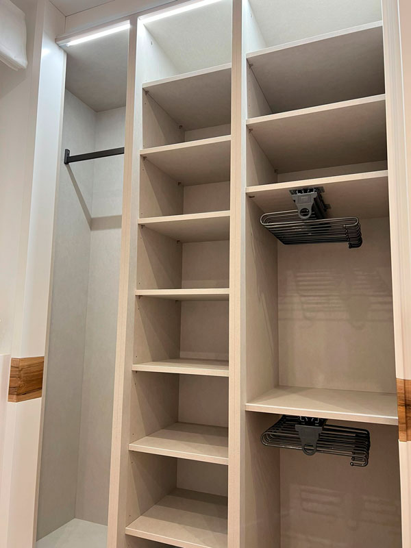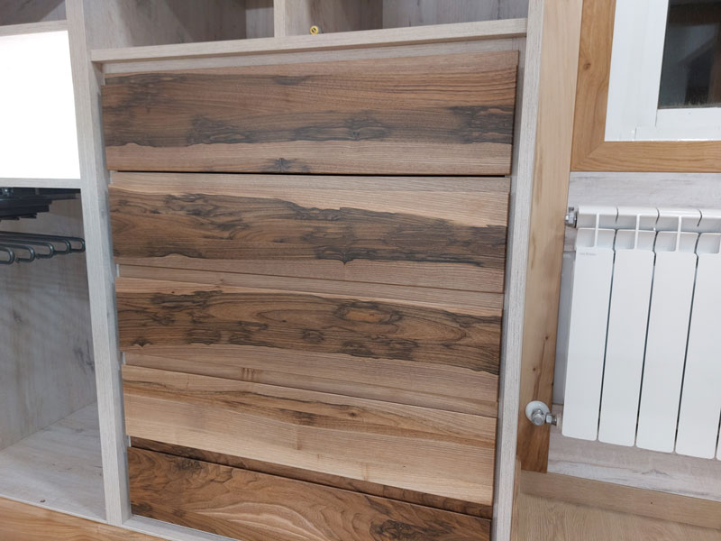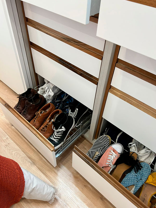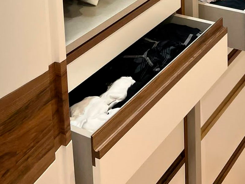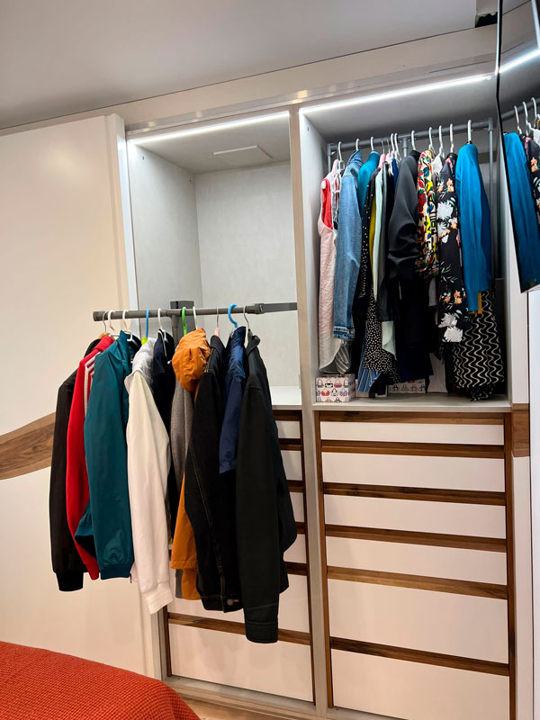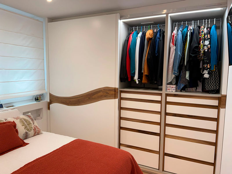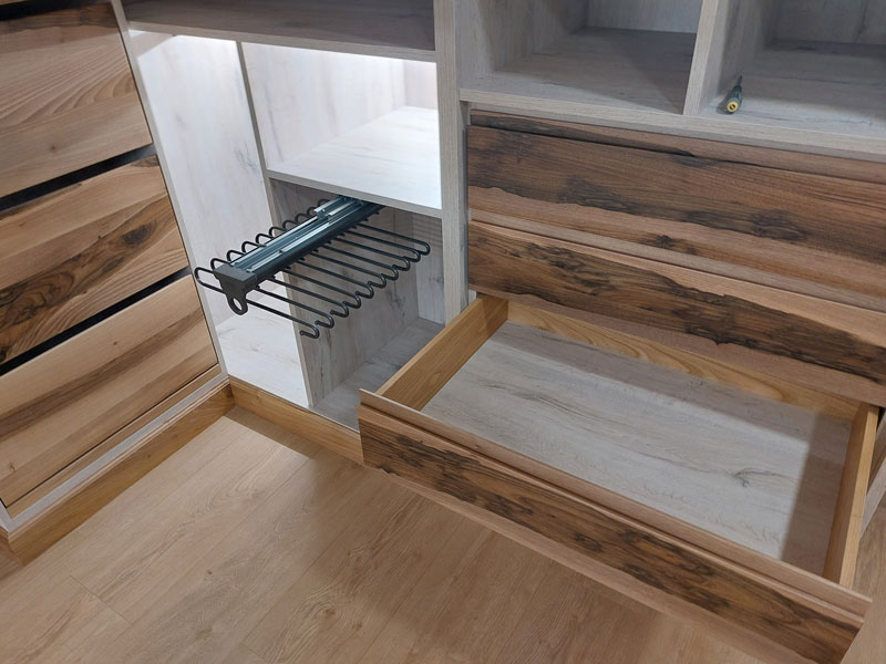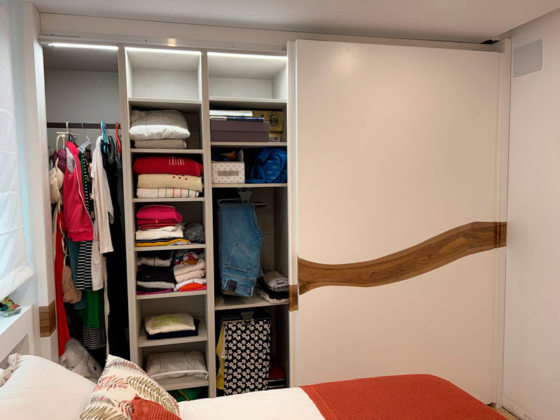 Vestidor adaptado a teitos inclinados baixo cuberta. Fabricado en taboleiro de melamina hidrófuga de deseño nórdico, con frontes de caixón, frontes de zapateiros, zócalos e cornixas en madeira maciza de Nogueira do país. Conxunto completado con diversos elementos como iluminación led con acendido por detector de movemento, barras de colgar, pantaloneiros, guías de caixón con peche amortecido, zapateiros, etc…