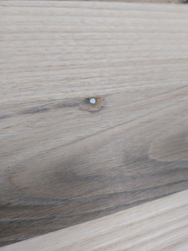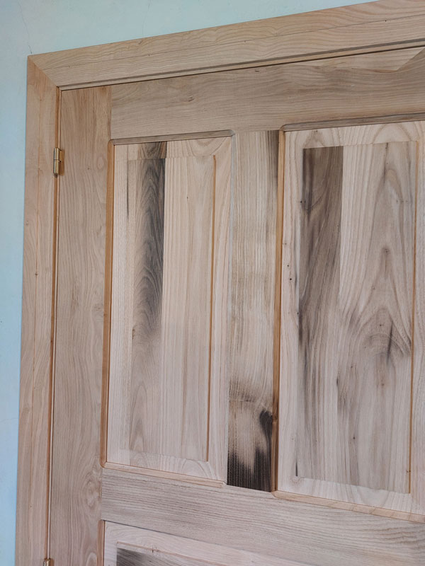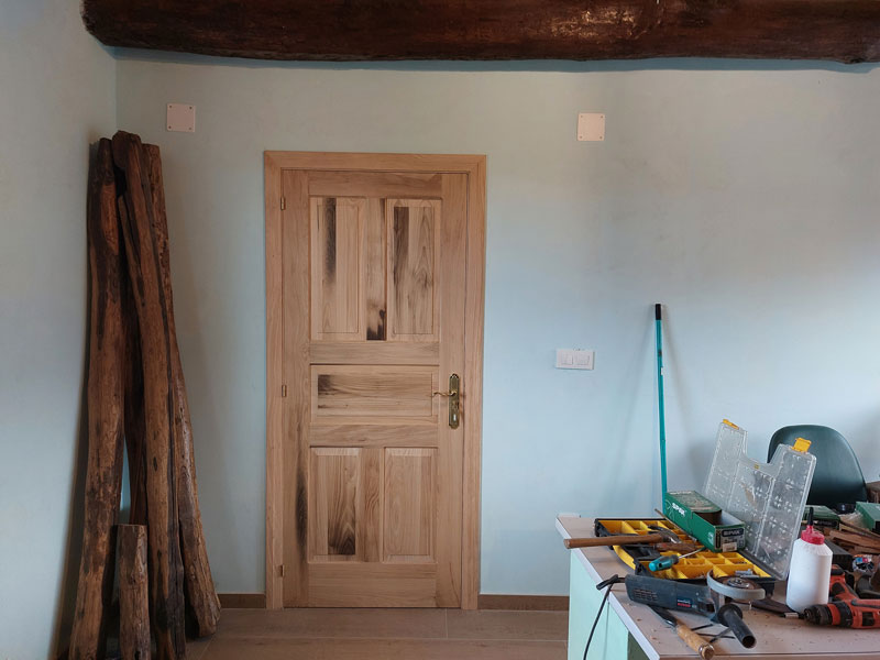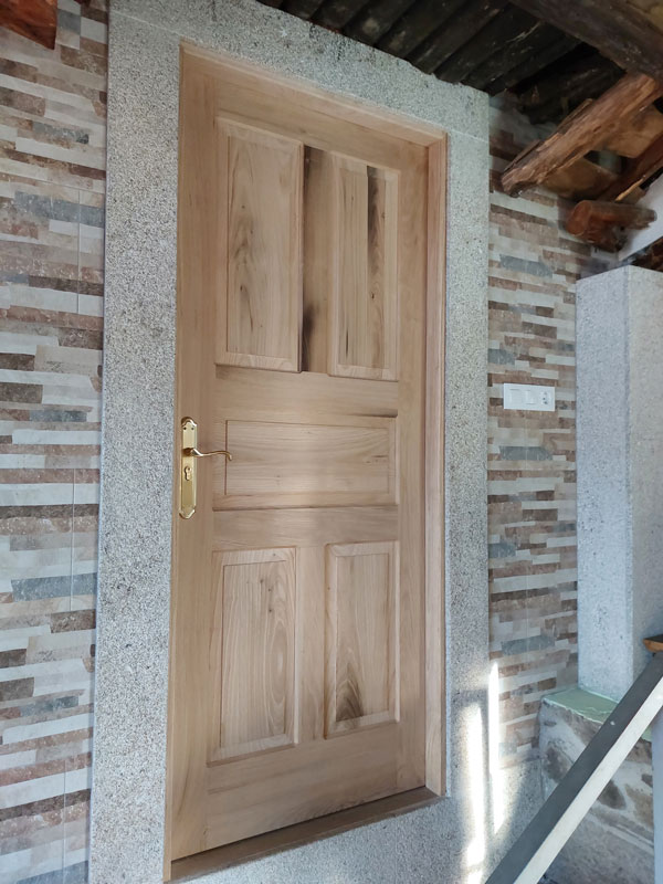 Porta fabricada a medida con madeira de castaño reciclada e proporcionada polo cliente. O resultado e una porta de porte clásico que incorpora as manchas e peculiaridades de cada pedazo de madeira.