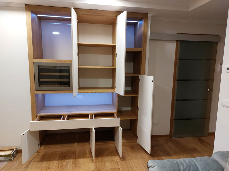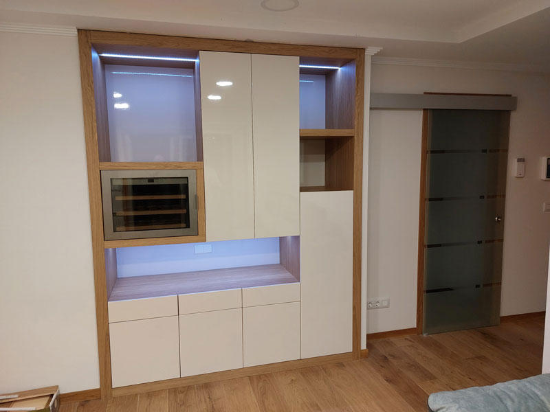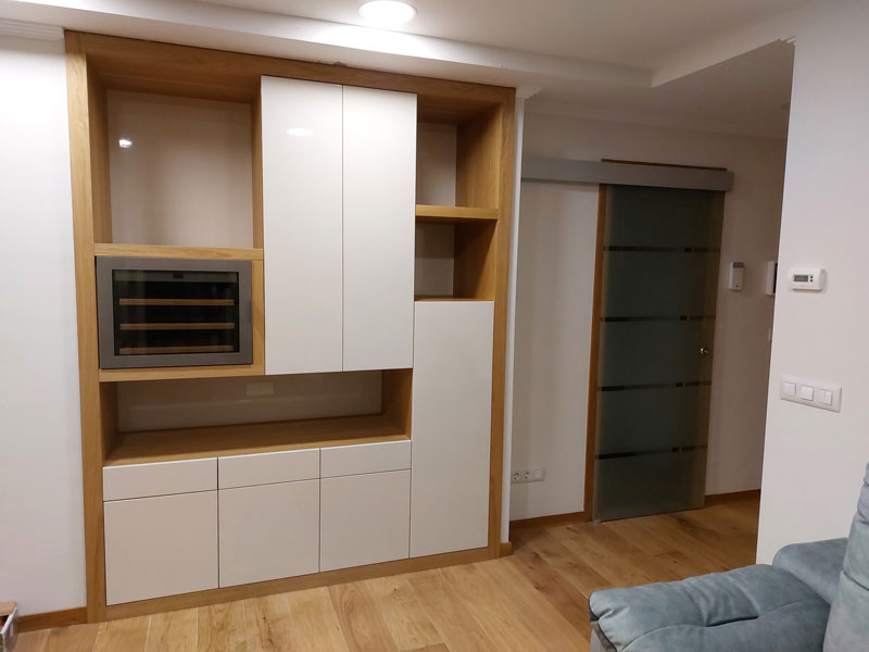 Moble en salón con función viñoteca, fabricado en combinación de contrachapado de Roble e paneis lacados alto brillo. Bisagras e guías de caixón con sistema push to open e iluminación led que da protagonismo o lacado alto brillo.