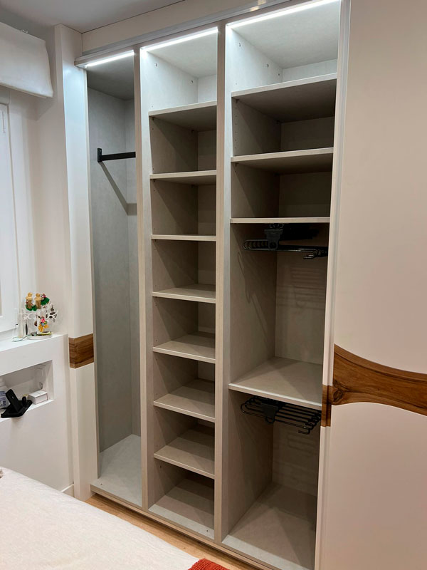 Armario encaixado con interiores fabricados en taboleiro de melamina gris con acabado pel. Os interiores están completamente equipados con todo tipo de complementos para aproveitar o espacio ata o ultimo centímetro, colgadoiros abatibles, caixóns con peche amortecido, pantaloneiros, barras de colgar e zapateiros, todo acabado en color gris antracita. No apartado de iluminación, leva tiras de led na parte superior que acenden e apagan o abrir e pechar as portas.