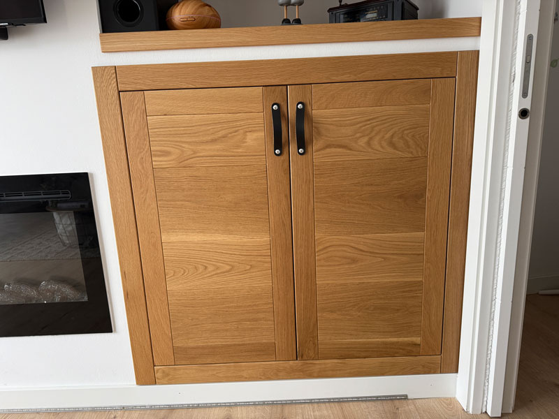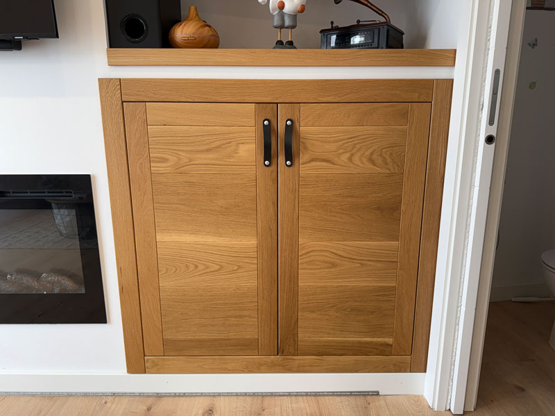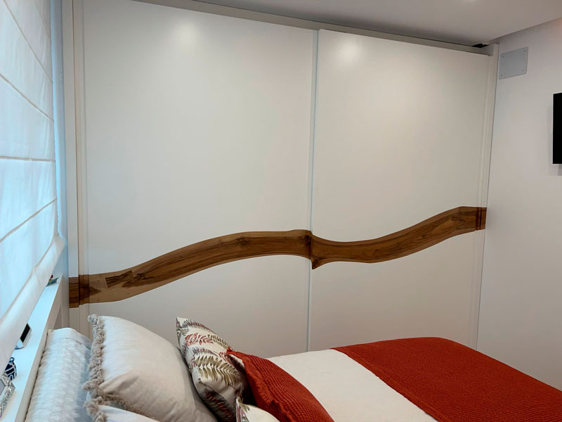 Mención especial para o fronte, que esta composto por dúas portas corredoiras de gran formato montadas sobre guías HETTICH XXL, que aportan una rozadura extremadamente silenciosa e peche amortecido. En este caso o cliente permitiume recrearme no deseño das portas e optei por un lacado branco con incrustacións de pezas de Nogueira do país serradas “a figura”, tamén fixen unas incrustación de bolboretas con contraste na veta para darlle a todo o conxunto un deseño completamente exclusivo.