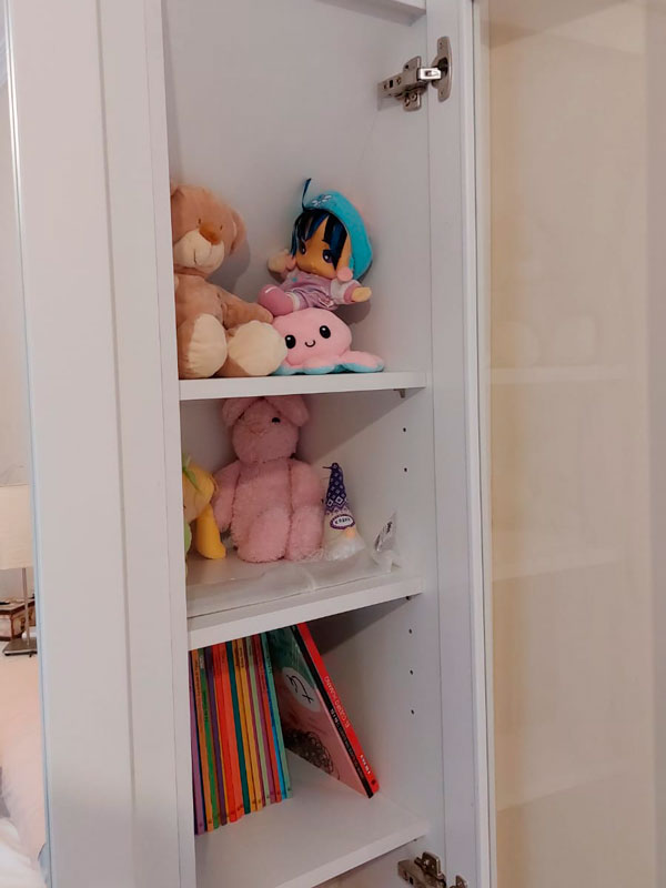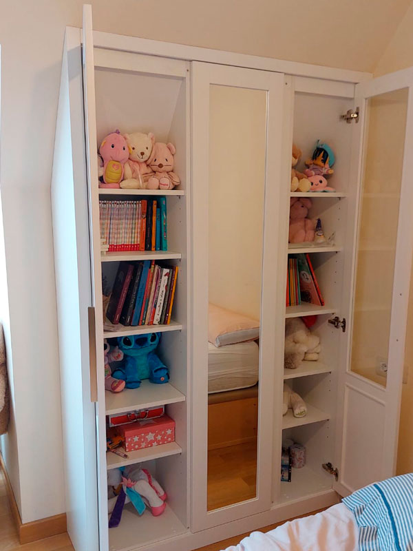 O armario esta fabricado en melamina hidrófuga branco Soft para os interiores e o espello e un laminado para evitar posibles accidentes en un entorno infantil.