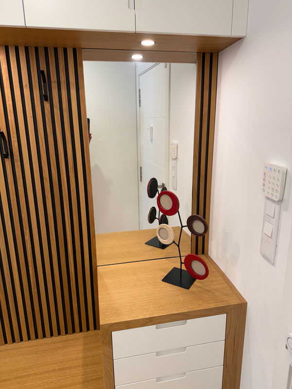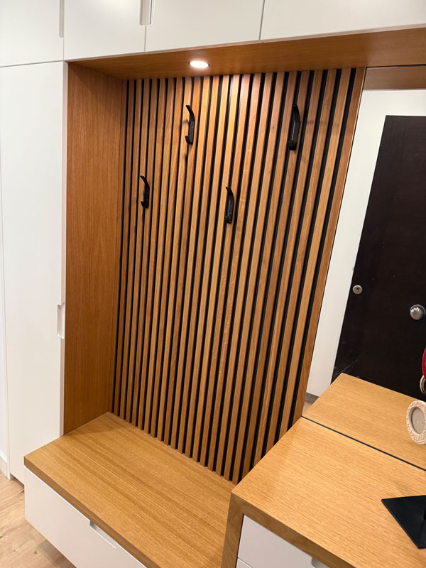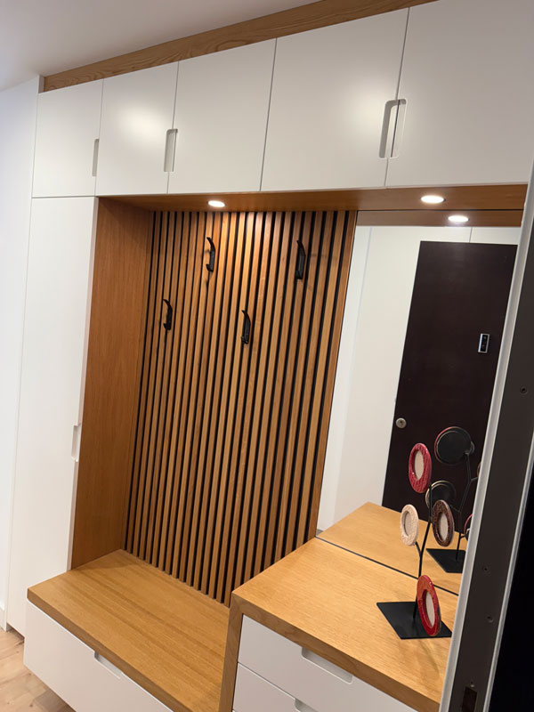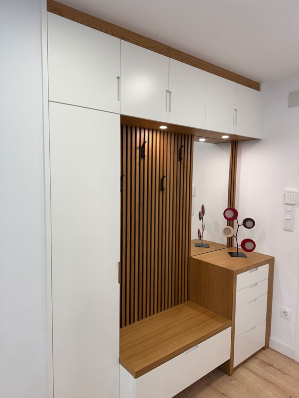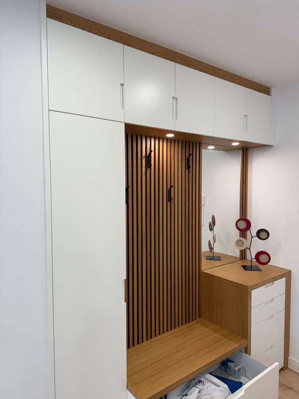 Amoblamento en zona de entrada e salón, combinación de madeiras macizas con contrachapados e paneis lacados. Portas, caixóns, baldas, colgadoiros e iluminación para dar un toque cálido e actual.